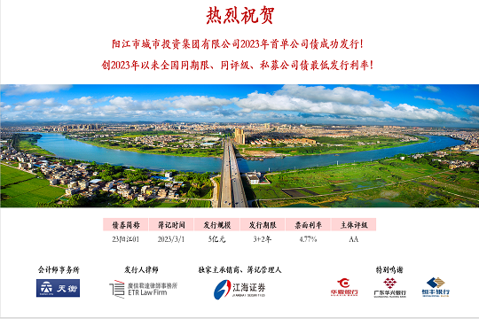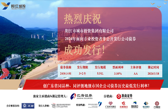 2024年1月19日,市城投集團(tuán)在深圳證券交易所成功發(fā)行“陽江市城市投資集團(tuán)有限公司2024年面向?qū)I(yè)投資者非公開發(fā)行公司債券”。本期債券發(fā)行規(guī)模為5.5億元,期限為5(3+2)年,票面利率3.10%,全場(chǎng)認(rèn)購倍數(shù)超過4.8倍,是...