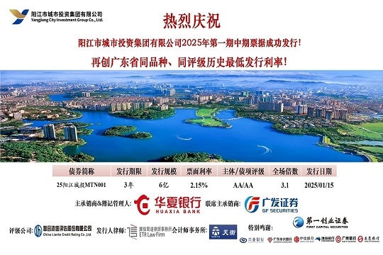 2025年1月15日,市城投集團(tuán)在中國銀行間交易商協(xié)會(huì)成功發(fā)行“陽江市城市投資集團(tuán)有限公司2025年第一期中期票據(jù)”。本期債券發(fā)行規(guī)模為6億元,期限為3年,票面利率2.15%,全場(chǎng)倍數(shù)超過3.1倍,合計(jì)申購機(jī)構(gòu)數(shù)23家。本期債...